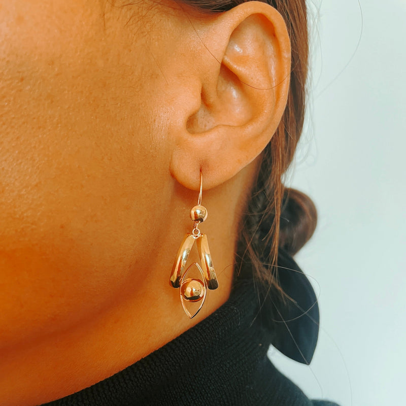 The chandelier drop earrings are a subtle statement for day-to-evening looks. These preloved, 18 carat gold earrings feature a gold geometric silhouette that can be style solo for an elevated everyday look, or pair with a selection of studs and small hoops for a curated finish.