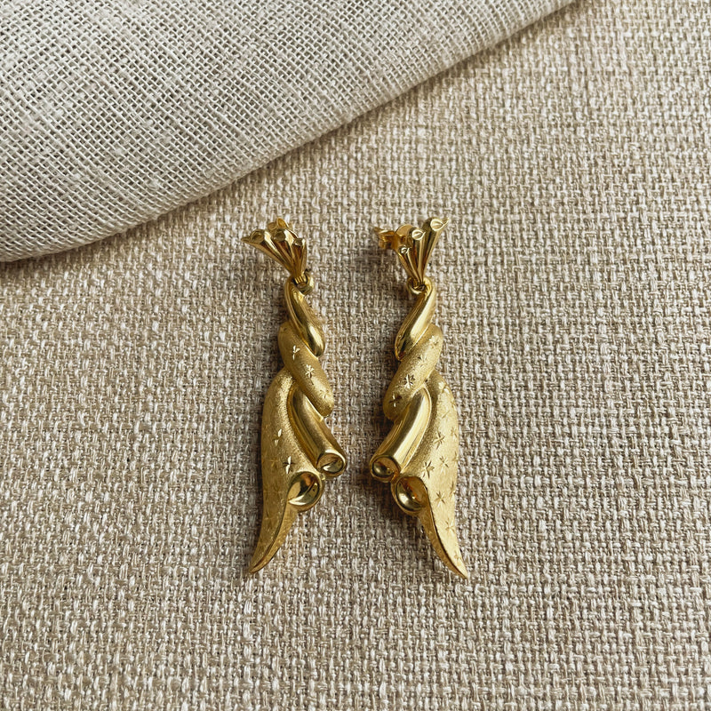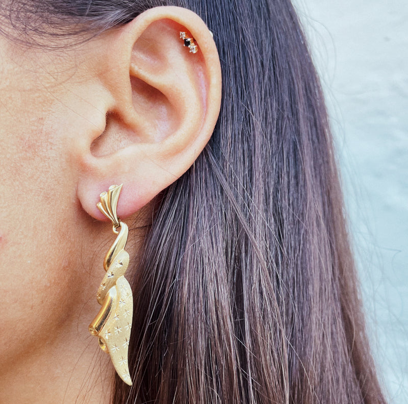 These show stopping, statement earrings are sure to turn a few heads. Designed to portray a gold swirl with engraved star detail. The perfect pair of earrings to wear solo to wear to your next occasion.